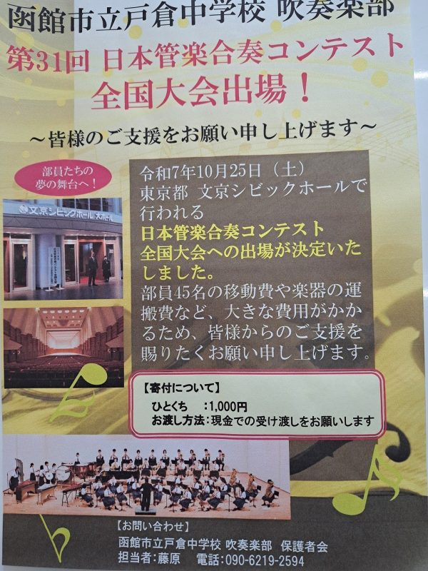 函館市の戸倉中学校吹奏楽部が全国大会へ出場だそうです。